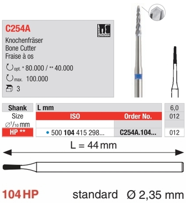 Knochenfräser C254AKnochenfräser zur schonenden Bearbeitung von Knochen- und Zahnhartsubstanz. Diespezielle A-Verzahnung gewährleistet einen sehr ruhigen Instrumentenlauf bei höchsterSchnittleistung unter maximaler Schonung der zu zer