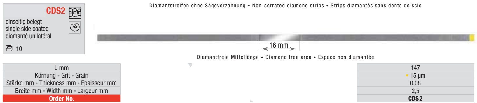 Diamant Finier Streifen ohne Sägeverzahnung und für Autoklav sowie Thermodesinfektor geeignet.Sichere anatomische Gestaltung der approximalen Bereiche. Wirtschaftliche Standzeit durch Verwendung von hochstabilem rostfreien Stammmetall.