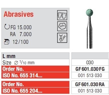 Schleifkörper aus hochwertigem Silizium-Karbid mit keramischer Bindung. Speziell geeignet für das schnelle, formgenaue Konturieren und Finieren von Keramik, Kunststoff und Metall-Legierungen (Gold, Silber, Amalgam). Korngrösse = mittel. Bindung = mittelhart.