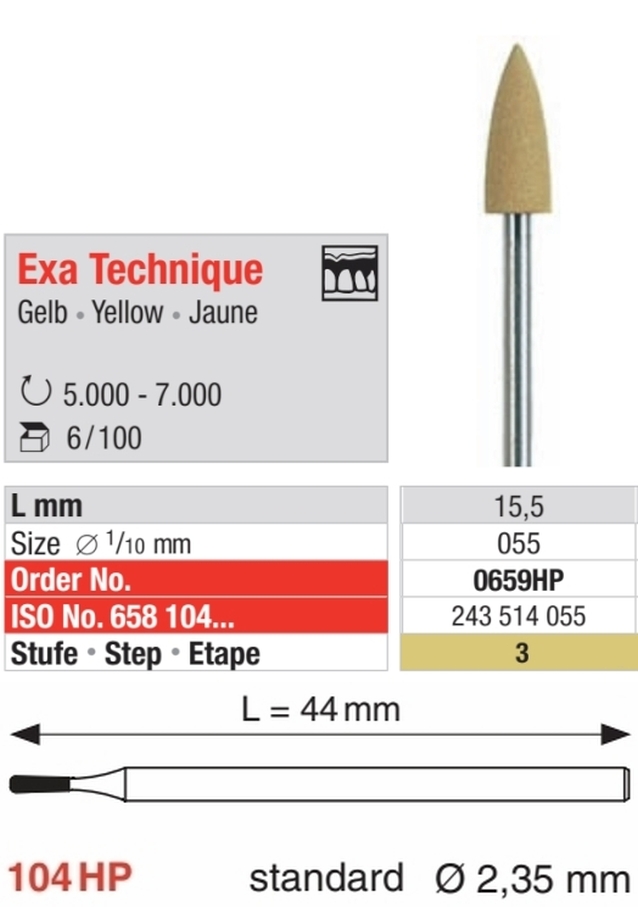 Exa Technique3 - Stufen Poliersystem für prothetische und kieferorthopädische Kunststoffe.Hochglanz - Politur.3. Stufe = Gelb: Feine KörnungSilikon - Polierer zur optimalen Glättung und Verdichtung der Material - Oberfläche.Erzeu