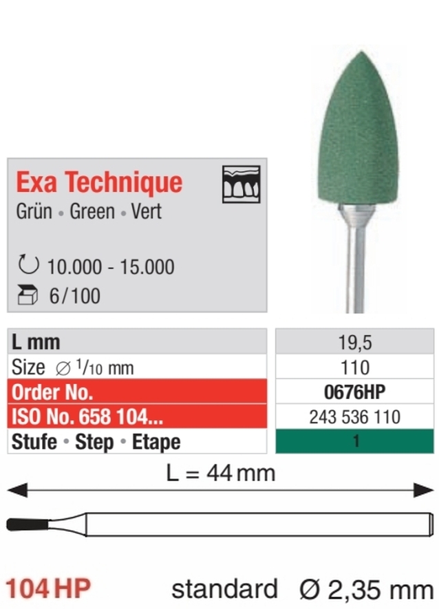 Exa Technique3 - Stufen Poliersystem für prothetische und kieferorthopädische Kunststoffe.Vorschleifen, für schnellen Materialabtrag.1. Stufe = Grün: Grobe KörnungSilikon - Polierer zum Finieren und Konturieren.Entfernt Kratzer u