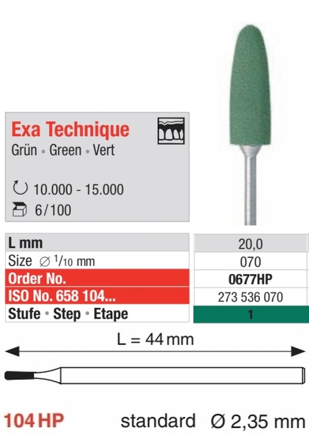 Exa Technique3 - Stufen Poliersystem für prothetische und kieferorthopädische Kunststoffe.Vorschleifen, für schnellen Materialabtrag.1. Stufe = Grün: Grobe KörnungSilikon - Polierer zum Finieren und Konturieren.Entfernt Kratzer u