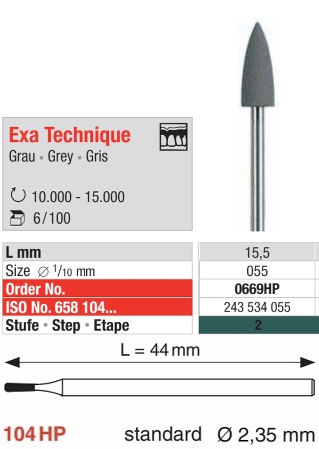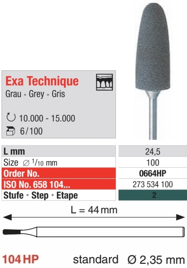 Exa Technique3 - Stufen Poliersystem für prothetische und kieferorthopädische Kunststoffe.Polieren, zur Oberflächenglättung.2. Stufe = Grau: Mittlere KörnungSilikon - Polierer zum Glätten und Verdichten der Material - Oberfl