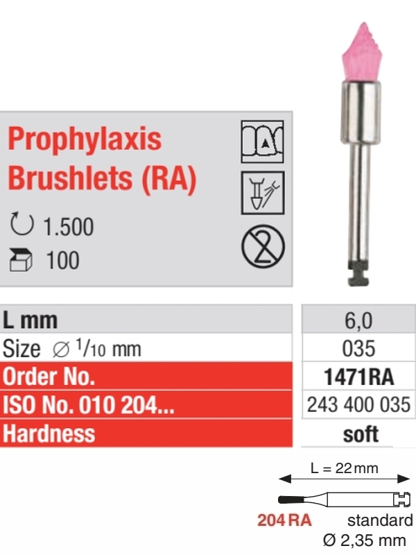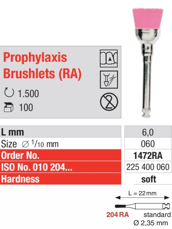 Weiche Nylon-Bürsten zum Entfernen von Zahnbelag in Sulkusnähe, zur Schonung des Weichgewebes.Verwendung mit Polierpaste. Einmalanwendung, nicht autoklavierbar