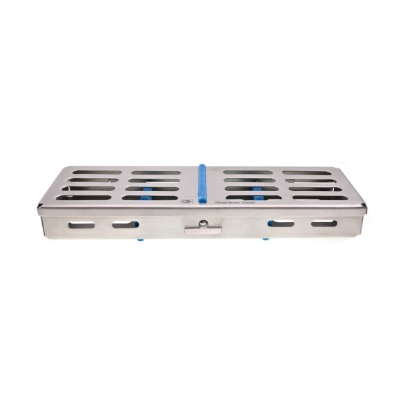Steri-Wash-Tray aus rostfreiem Edelstahl mit Silikoneinsätzen. Für 5 Instrumente. Für Autoklav und Thermodesinfektor geeignet. Maße: L= 185mm - B= 70mm - H= 22mm.